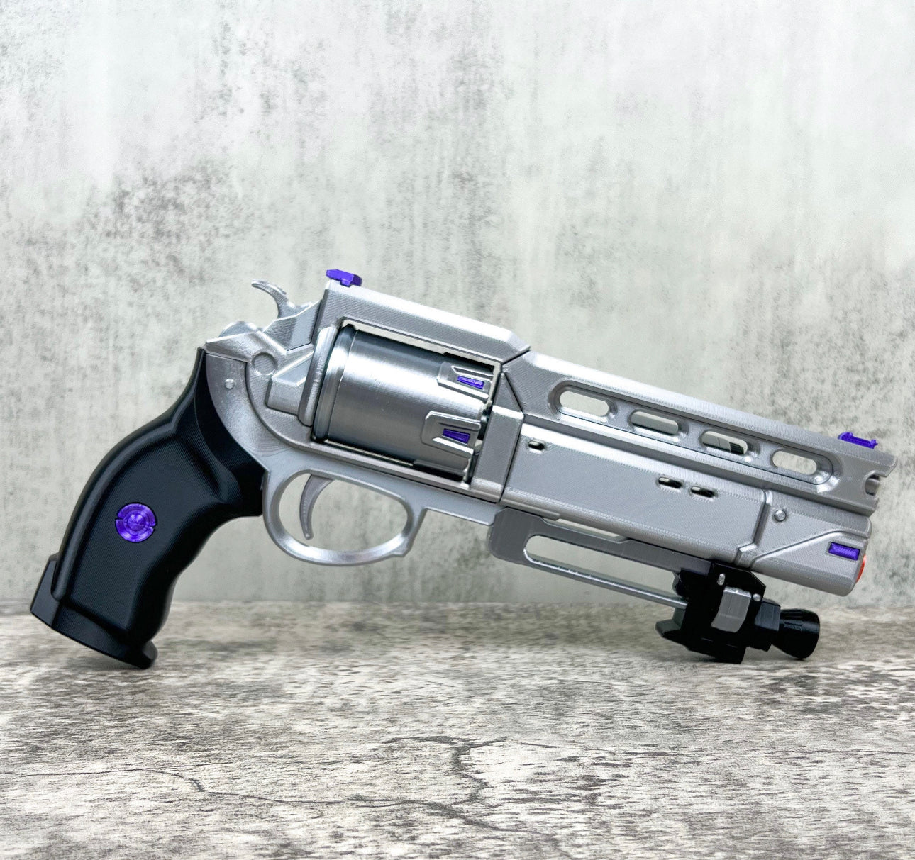 This gun is 3D printed of PLA plastic (human-friendly material), assembled and sanded, hand painted with acrylic paint and varnished with a satin/glossy finish, so the paint could remain as long as possible.